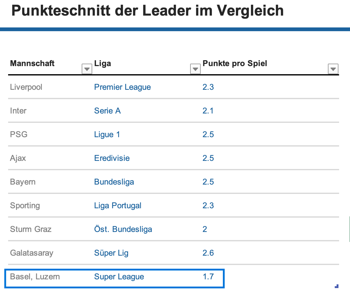 Leader in der Super League, Viertelfinale im Schweizer Cup und direkter Einzug in das Achtelfinale der Conference League – eine Ausbeute, von der andere Schweizer Mannschaften nur träumen können. Allerdings trügt der Schein. Mit 1,6 Punkten, die der FC Lugano pro Super-League-Spieltag im Durchschnitt einfährt, schneidet er im europäischen Vergleich miserabel ab. Ein Blick nach England, Italien, Deutschland und Spanien sowie in die Niederlande, Türkei, Portugal und Österreich zeigt: Eine Mannschaft mit einem solchen Punkteschnitt spielt meist um die Plätze vier und fünf, wenn nicht sogar tiefer. Zudem sind Mannschaften in solchen Ligen meilenweit vom Leader entfernt. Lugano trennen hingegen nur drei Punkte zu den aktuell Erstplatzierten Basel und Servette. Somit lautet das Fazit: Der FC Lugano ist nur deshalb im Meisterrennen, weil die Spitze der Super League besonders schlecht abschneidet . Eigentlich sind die Leistungen der Tessiner nicht würdig, um ein Titelanwärter zu sein.